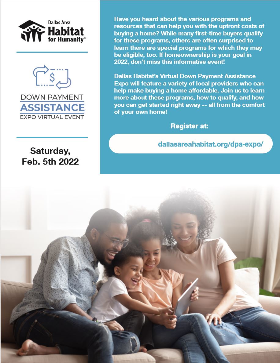 If you're interested in learning how you can saving thousands of dollars, and get into a new home in 2022, tune in on Saturday, February 5th from 10AM to 12:30PM for the Down Payment Assistance Expo Virtual Event. Register HERE and log in via Zoom to get the process started.