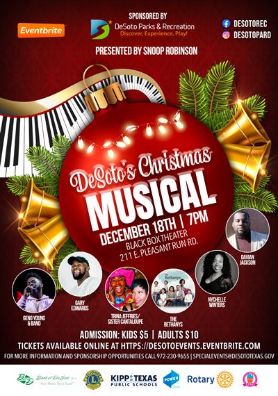 The Desoto Christmas Musical is happening on Saturday the 18th at 7PM. There will be several powerhouse musical acts to get you in the holiday spirit. Adult admission is $10 and kids admission is only $5. Click HERE for tickets and more info.