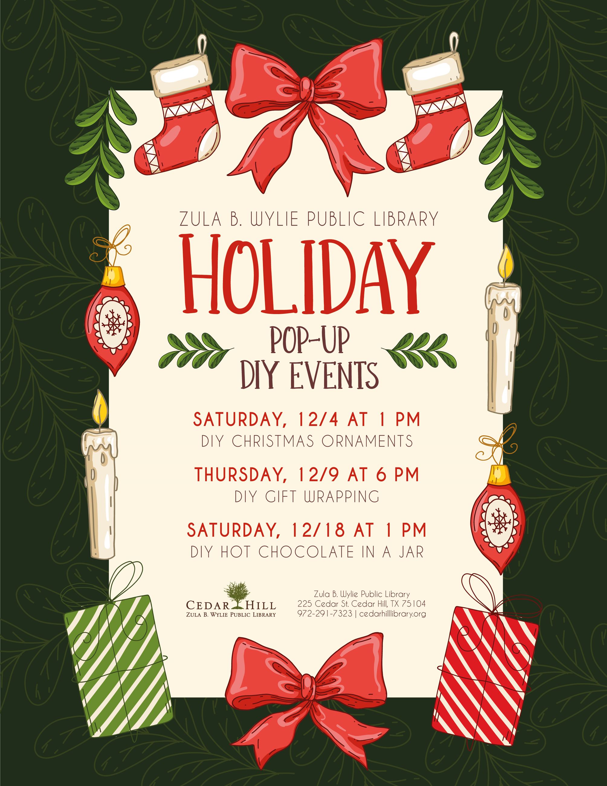 The Zula B Wylie public library is the center of the holiday festivities in Cedar Hill. There are three pop up events that are free for kids of all ages on the first, second, and third Saturday of December.