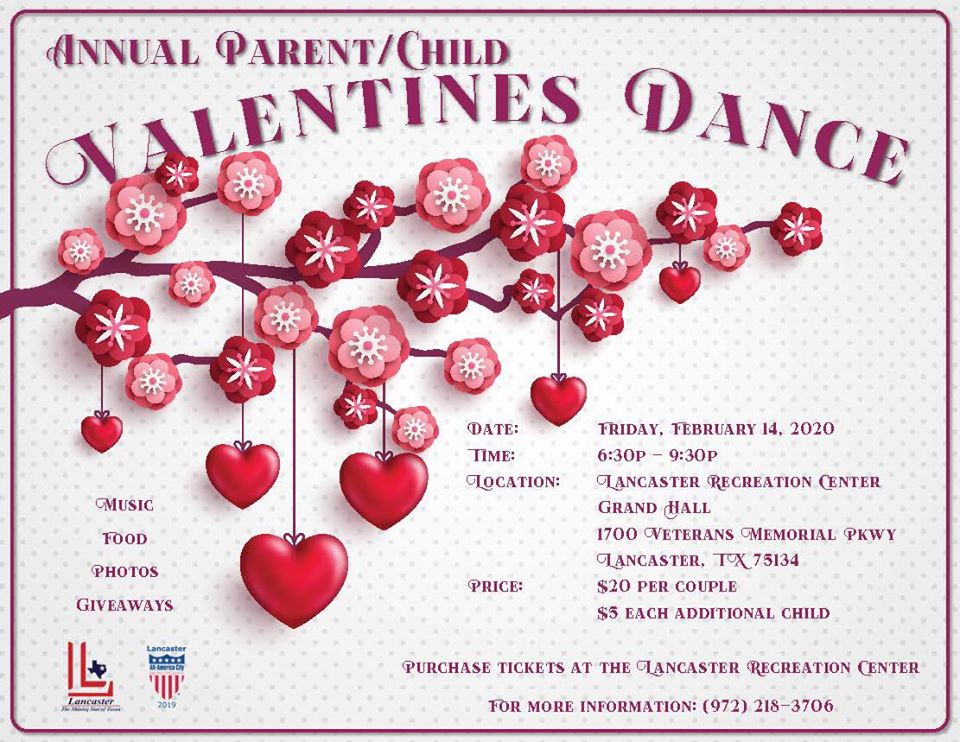 Once again the City of Lancaster comes thru in the clutch! The annual Parent/Child Valentine's Day Dance will be held on February 14th from 6:30 to 9:30PM at 1700 Veteran's Memorial Parkway Lancaster TX. The cost is $20 per couple, and $5 for each additional child. For more info call (972) 218 - 3706 or click HERE